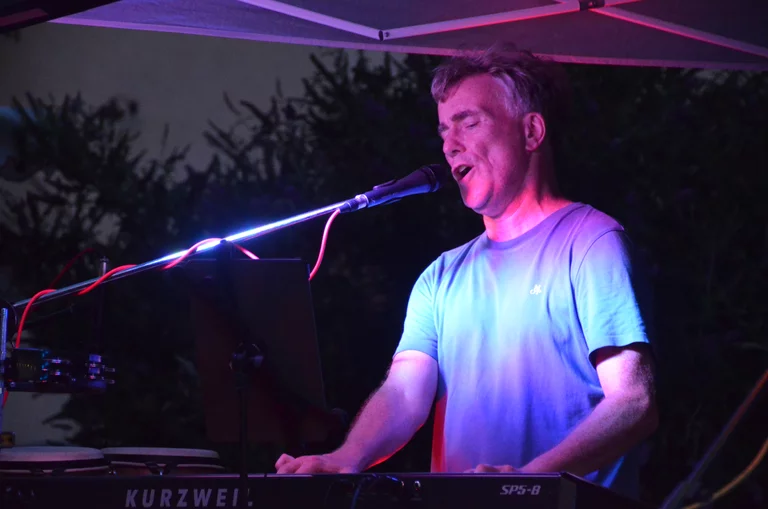Der Tastenmann am Mikro, der manchmal auch Congas, Kuhglocke und Schellenkranz bedient und die Stücke mit Ansagen verbindet, die ihn manchmal sogar selbst überraschen