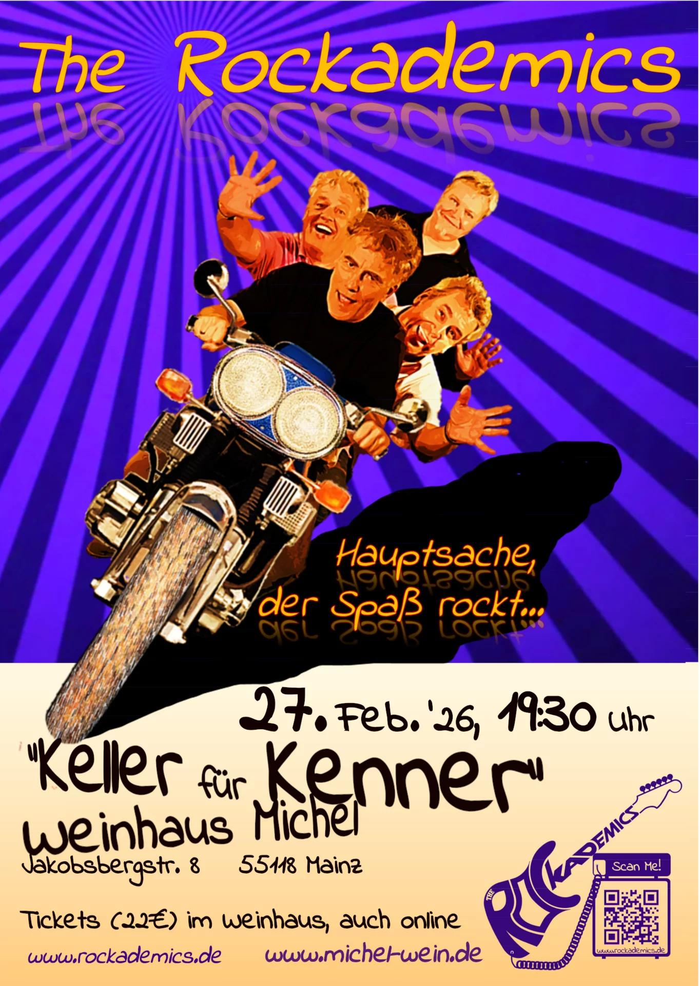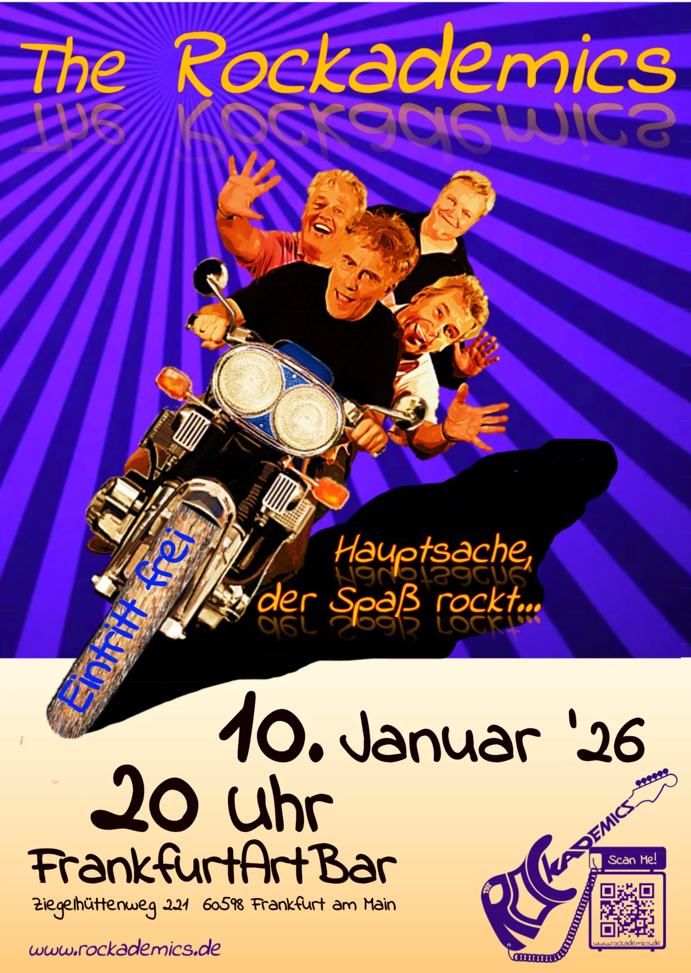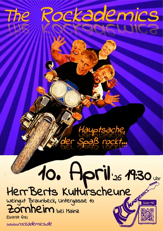 Wir sind live, mit maximaler Spielfreude, mit allem, was rockt, auch mal bluesig, jazzig, poppig. Bekannte und weniger bekannte Songs in der ganz eigenen The-Rockademics-Art, von uns "veredelt" (welche Songs? Steht hier!). Vier Musiker aus dem Rhein-Main-Gebiet, die schlicht und einfach Spaß haben an ihrer Musik und diesen Spaß gern mit ihrem Publikum teilen.